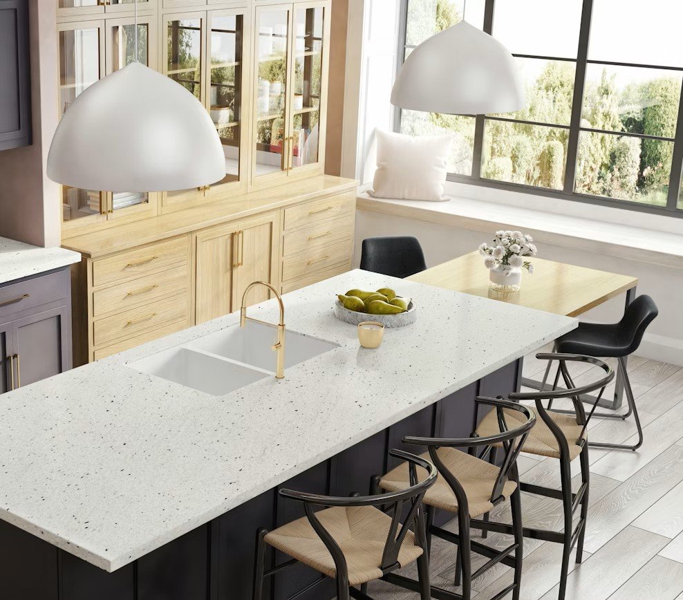 Braziliškas granitas Siberia su baltu fonu, primenančiu nesugadintą Sibiro sniego spalvą. Jo raštui būdingos mažos juodos dėmės.